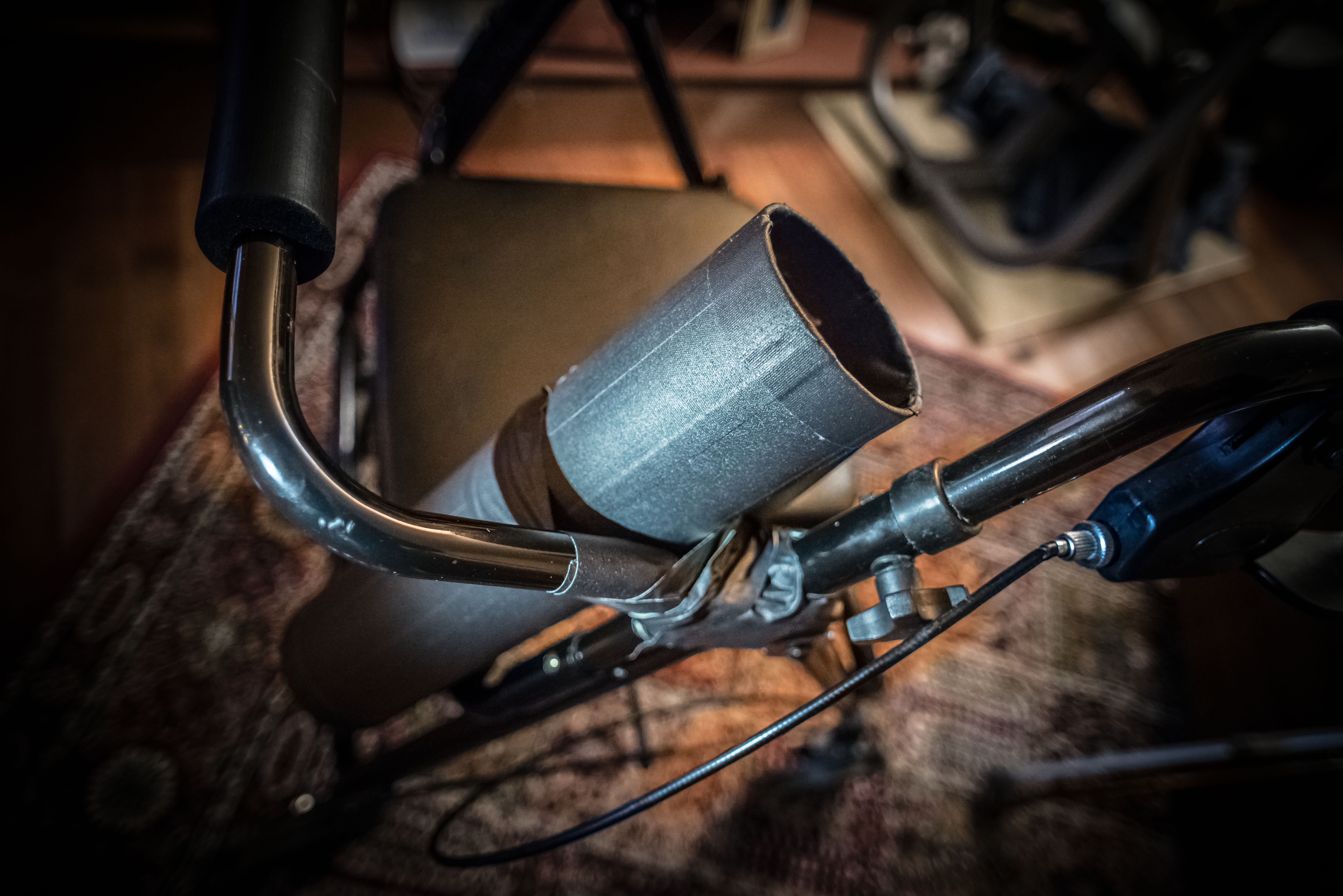 The simple cane holster that I devised using a short poster tube and gaff tape.