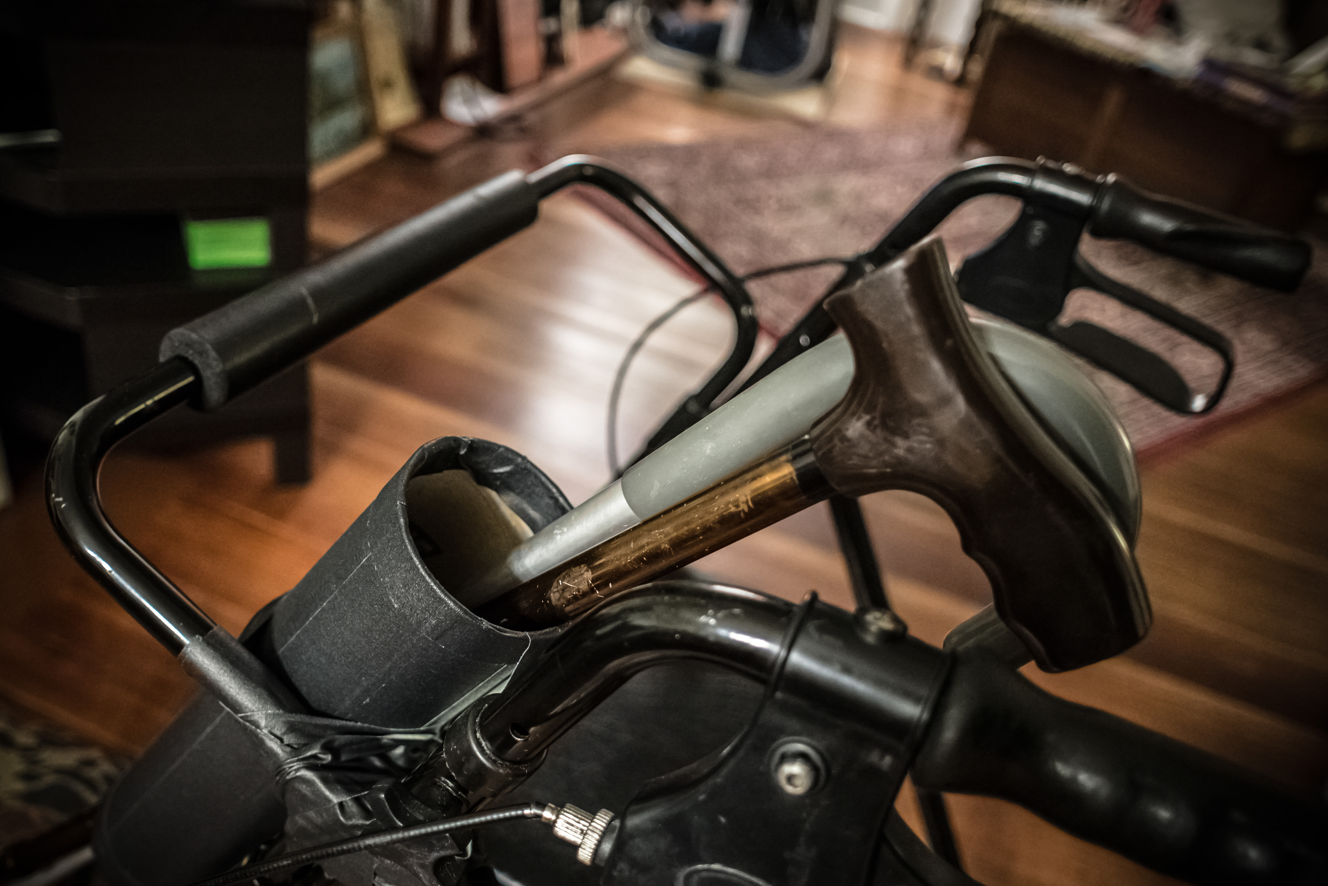 The next day I found this old poster tube.  I fixed it to her walker using gaff tape.  Tonight I covered the rest of the tube in gaff tape to make it more durable and give it a more uniform appearance.  Now, she’s always got both canes with her.  She’s not constantly struggling with them and she can concentrate on simply going slowly and not falling.